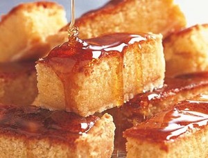 - 4. Enfournez le gâteau 35 à 40 min. Laissez-le refroidir et découpez-le en rectangles. Juste avant de servir, nappez du reste de miel chaud.