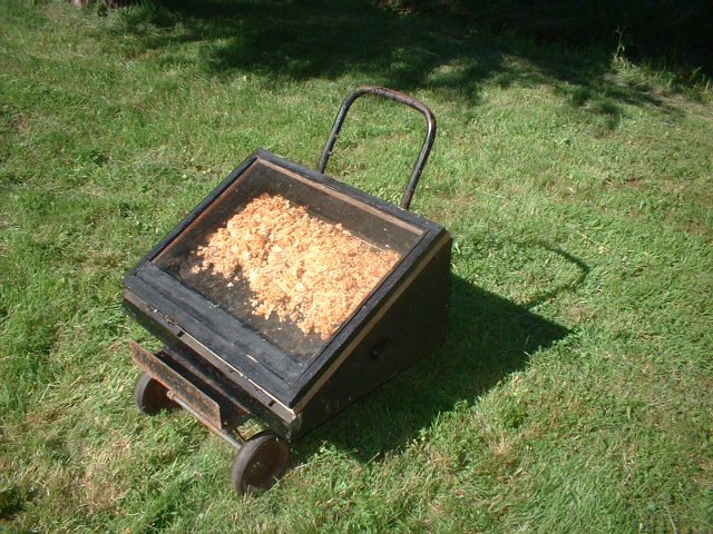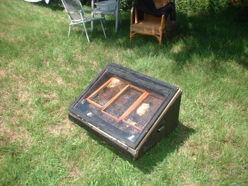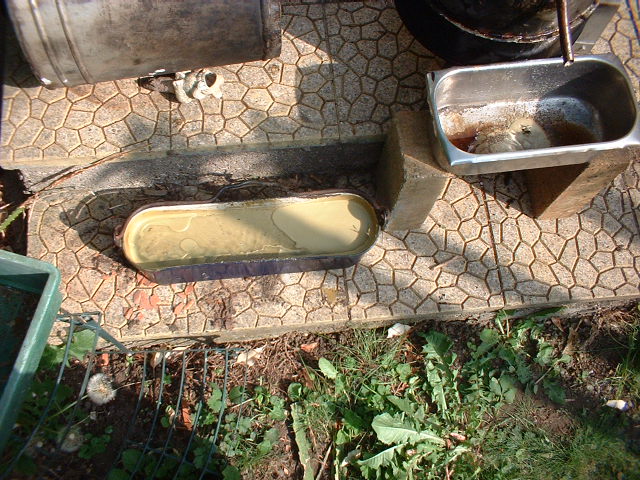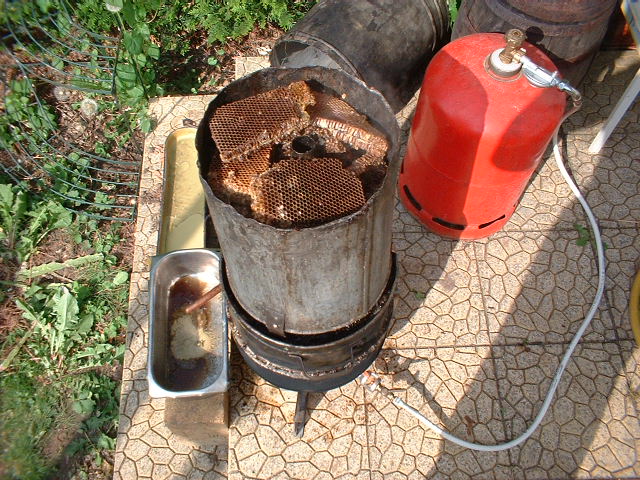 Une fois fondue la cire doit refroidir très lentement (isoler avec journaux ou tissus) afin d’éviter les crevasses et aussi pour que les impuretés tombent au fond du récipient et forme un « pied » que l’on gratte par la suite... une refonte donne alors un produit parfait. Le démoulage est facilité si le moule a été enduit d’eau savonneuse. On voit sur la photo ci-dessous 3 cadres dont la cire fond ; les fils verticaux ne sont pas distendus ; on peut reposer la cire à la suite. La température monte facilement à 80° ce qui est certainement un + sanitaire.