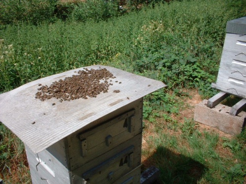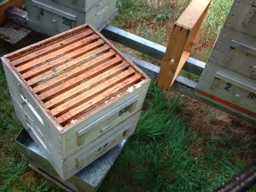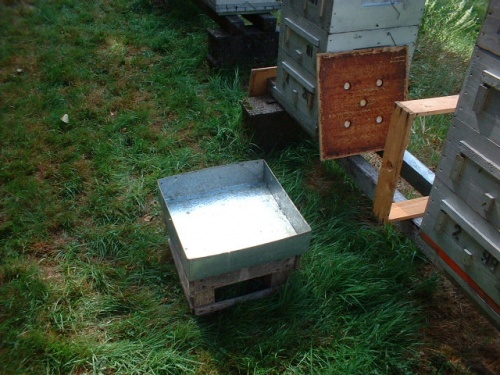 Nous poursuivons en décollant avec un levier ou fort tournevis les quatre coins de la hausse. Une fois rendue mobile nous soulevons la hausse et la posons en arrière de la ruche sur un support mince et résistant comme par exemple en quinconce (pour ne pas écraser d'abeilles) sur un toit tôle renversé. (photo) Aussitôt nous refermons la ruche.