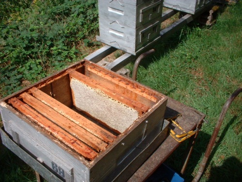 Autre conseil : utilisez une pince lève-cadre qui maintient solidement le cadre et libère une main. Pour un plus grand nombre de hausses je les installe, en fin d'après-midi à une bonne distance du rucher (30m... 50 ou plus est mieux) sur un support. Les abeilles viennent lécher en masse le miel restant mais la distance ne provoque pas le pillage comme cela se fait si la distance est trop courte ; la nuit arrive tout se calme ; le matin de bonne heure le travail reprend jusqu'à la dernière goutte puis les abeilles, à part quelques fouineuses, désertent les rayons asséchés ; il ne reste plus qu'à les remiser en colonne sur un socle permettant un courant d'air de bas en haut. Un grillage sera posé aux deux extrémités pour empêcher les souris. Cette disposition de stockage ne convient pas à la fausse-teigne qui n'apprécie pas les courants d'air. De préférence faire le tri des cadres ; ceux contenant du pollen ou ayant eu du couvain à part car le pollen moisit et ceux « à couvain » attirent la fausse-teigne.