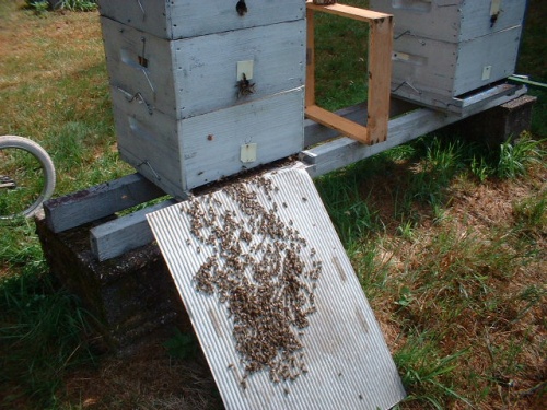 Le cadre débarrassé nous l'enfermons dans une seconde hausse bien hermétique et ainsi de suite... Il faut encore secouer-balayer les quelques abeilles qui restent sur les parois de la hausse maintenant vide Il est précautionneux d'aller jusqu'à la dernière abeille car il arrive que ce soit la reine qui est restée dans la hausse au lieu de descendre sur le couvain et on risque de la perdre. Il ne reste plus qu'à prendre délicatement la tôle avec ses abeilles et de l'insérer par un coin (ou en plan incliné jusqu'à terre) (photo) dans l'entrée principale ; les abeilles rentreront rapidement surtout si vous enfumez celles qui se trouvent à l'extrémité.