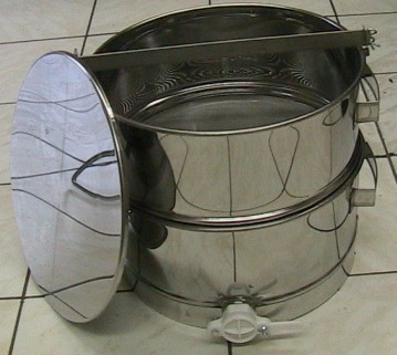 Inox.Simple tamis avec couvercle. Hauteur 35cm. Diamère 40cm.