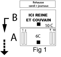 Evaluer la population au carreau de B (fig. 1) , si celui-ci est peuplé suffisamment et si la température est clémente inverser les 2 corps. (Mettre B à la place de A) (fig. 2) A cette occasion juger RAPIDEMENT l'état du couvain : si bien serré, sans manque dans les cellules = bonne reine=pas de maladie. Considérer les provisions, griffer le miel operculé autour du couvain. La reine va pondre rapidement dans le corps A supérieur qui doit posséder de beaux cadres bâtis vides dont les quatre cadres ôtés en Septembre que l'on a remis et griffés s'ils ont du miel... Si l'on n'en possède pas utiliser des cadres gaufrés. Surveillez le candi ou passez au sirop à 50/50. Cet apport nourricier se transforme (à cette époque et à cette dose) en chaleur, en jeunes abeilles et non en miel (frelaté !) comme certains le pensent ! Lors des manipulations, posez toujours les éléments en quinconce sur les parois minces en tôle d'un toit plat renversé... La propolis ne collera pas et le risque d'écraser une abeille, qui peut être une reine, sera quasiment nul. La reine est l'âme de la ruche. En pratique on la recherche rarement mais il faut y penser tout le temps !.