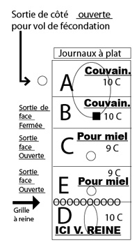 Mémo : Jour J transfert du couvain ouvert et, pose de la grille J+8 ou J+10, Choix de la cellule J+12, Naissance J+20, Fécondation (suivant météo?) J+25, Ponte, Contrôle de ponte J+30 à J+40.
